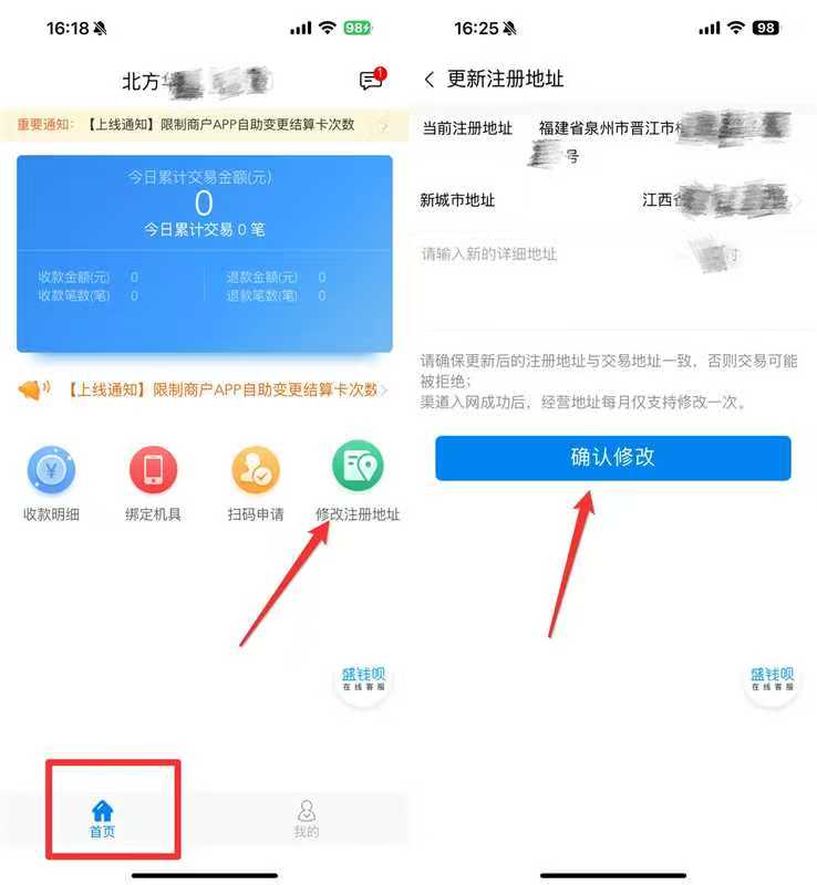 修改步骤:扫码机器背面下载最新版的“盛钱呗APP”-首页-修改注册地址-手动编辑新地址-确认修改