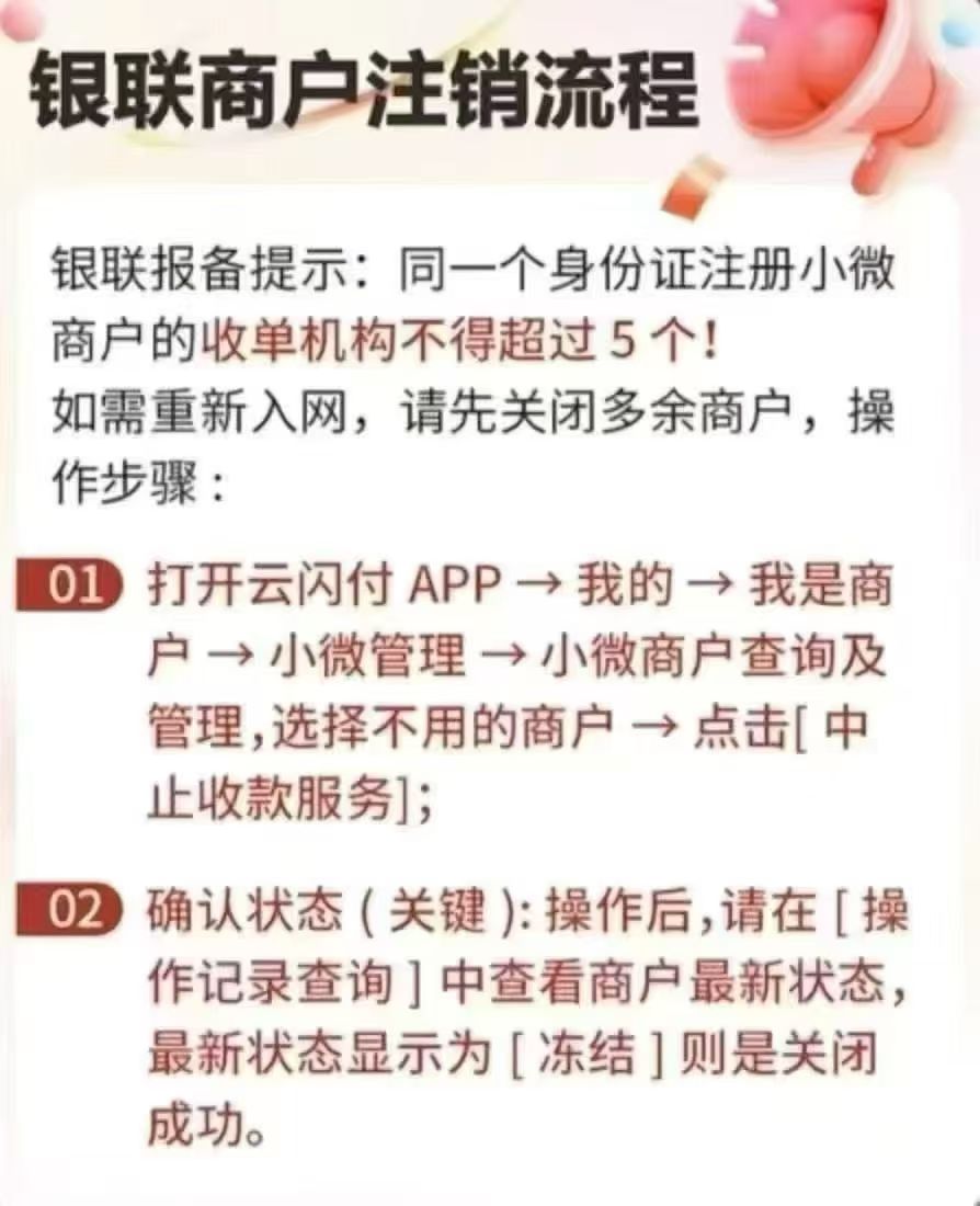 登录云闪付APP-我的-我是商户-小微商户管理-勾选需要中止收款服务的商户-点击“确认中止”-操作结果显示“完成”,商户已注销(预计10分钟生效)